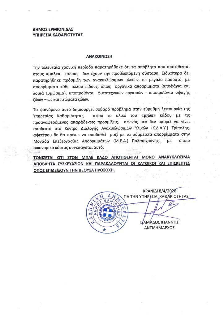 09 Απριλίου 2026 Τελευταία ανάρτηση:Ανακοίνωση για τον “Μπλέ” κάδο απορριμμάτων