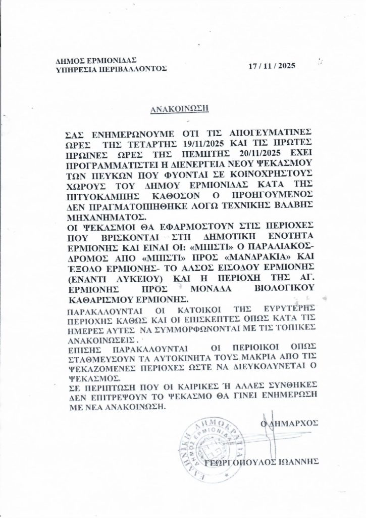 17 Νοεμβρίου 2025 Τελευταία ανάρτηση:ΑΝΑΚΟΙΝΩΣΗ: Ψεκασμοί πεύκων που φύονται σε κοινόχρηστους χώρους της ΔΕ ΕΡΜΙΟΝΗΣ