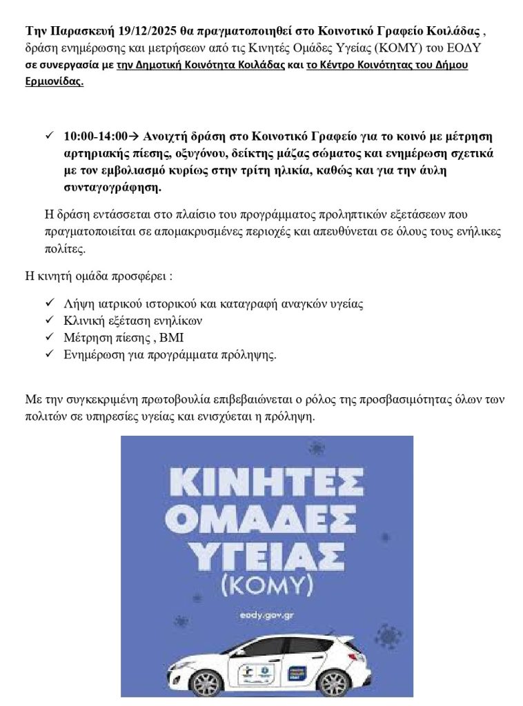 Ανοιχτή δράση στο Κοινοτικό Γραφείο Κοιλάδας για το κοινό με μέτρηση αρτηριακής πίεσης, οξυγόνου, δείκτη μάζας σώματος και ενημέρωση σχετικά με τον εμβολιασμό κυρίως στην τρίτη ηλικία, καθώς και την άυλη συνταγογράφηση