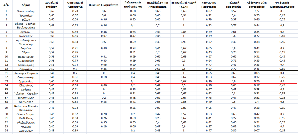 - Δείκτης Διαθεσιμότητας Ψηφιακών Υποδομών και Έξυπνων Υπηρεσιών με βάρος 7%, όπου ο Δήμος Ερμιονίδας πήρε 0,20.