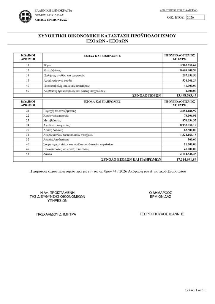 Συνοπτική οικονομική κατάσταση προϋπολογισμού 2026